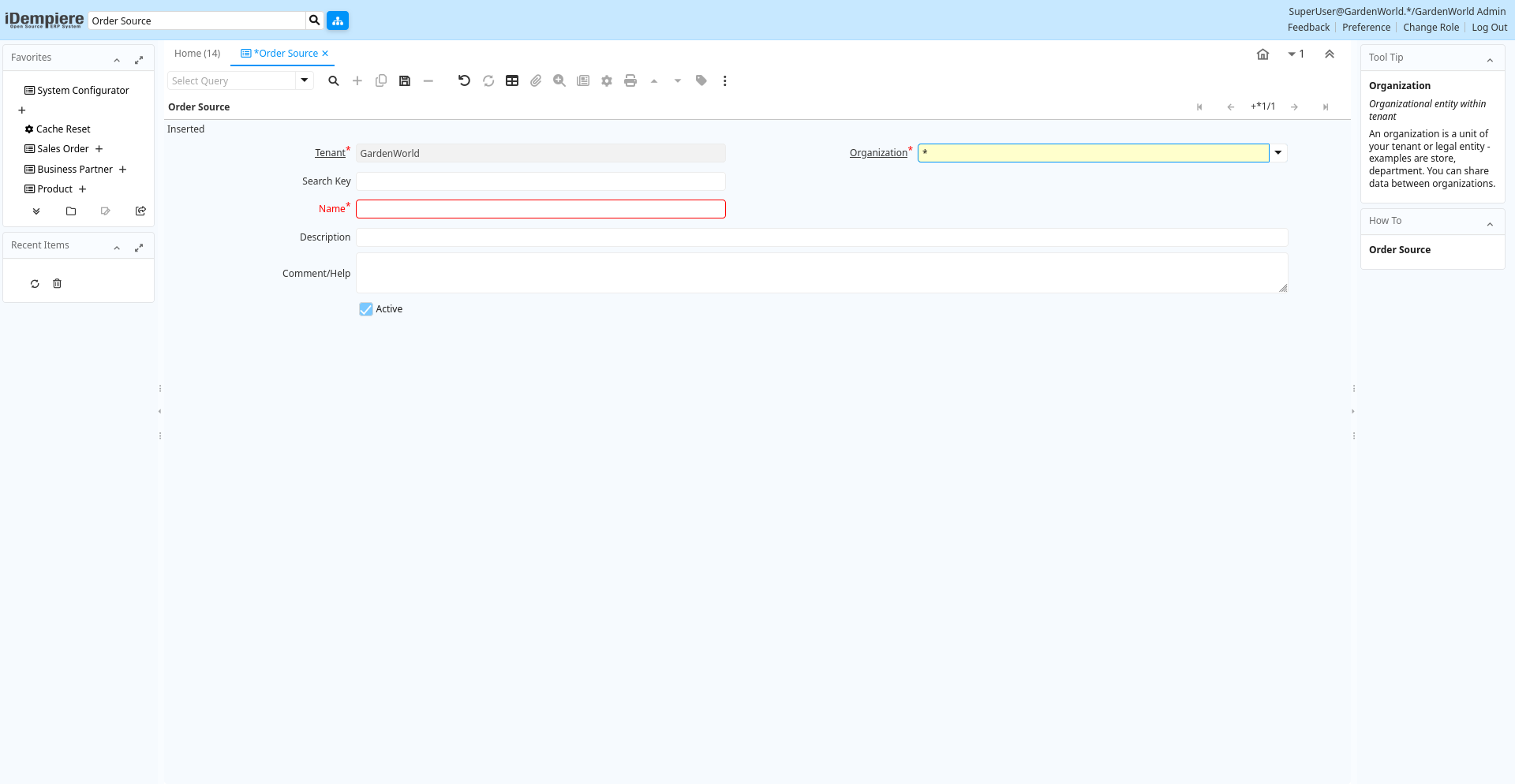 | Organization | Organizational entity within tenant | An organization is a unit of your tenant or legal entity - examples are store, department. You can share data between organizations. | c_ordersource.AD_Org_ID numeric(10) Table Direct |