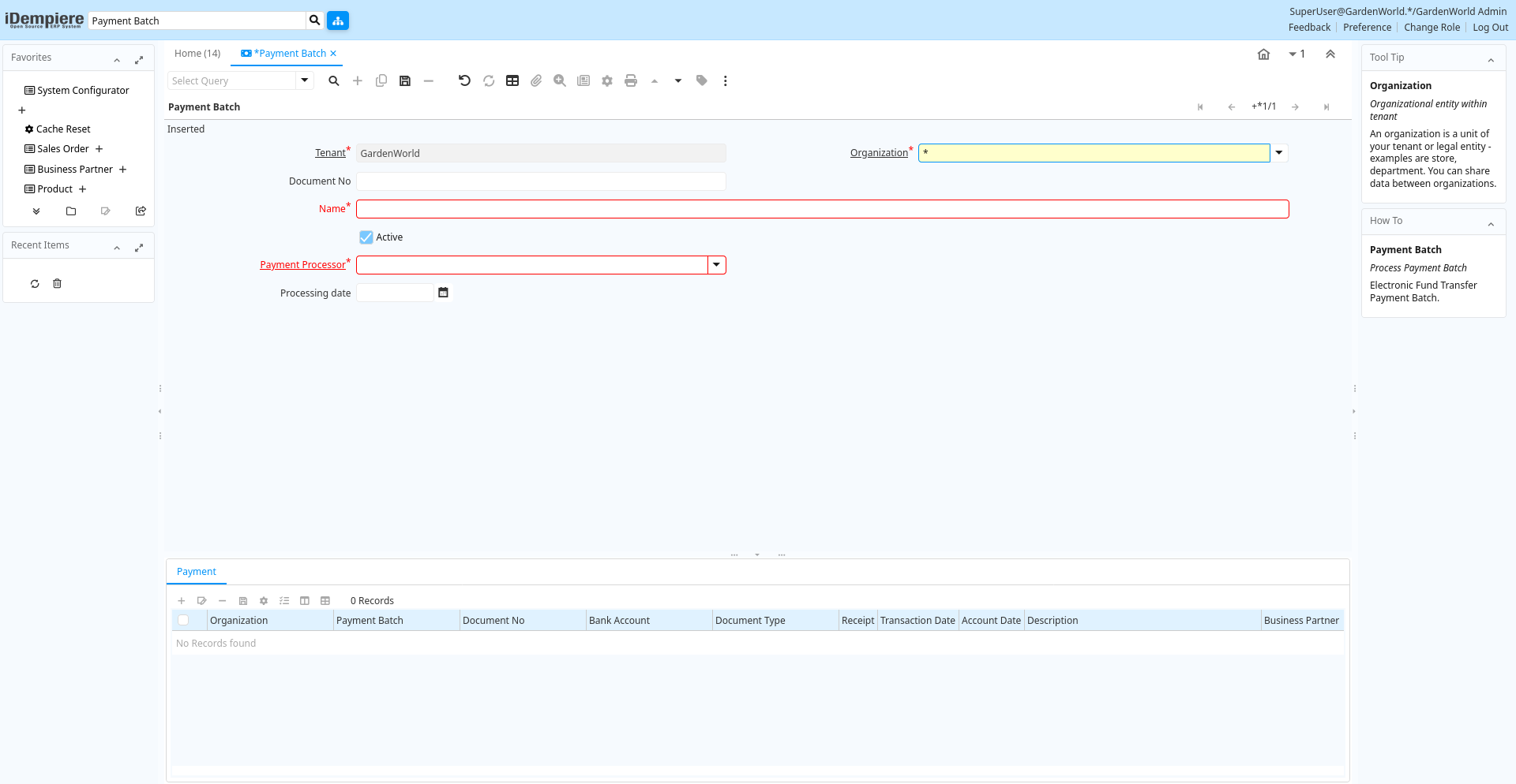 | Organization | Organizational entity within tenant | An organization is a unit of your tenant or legal entity - examples are store, department. You can share data between organizations. | c_paymentbatch.AD_Org_ID numeric(10) Table Direct |