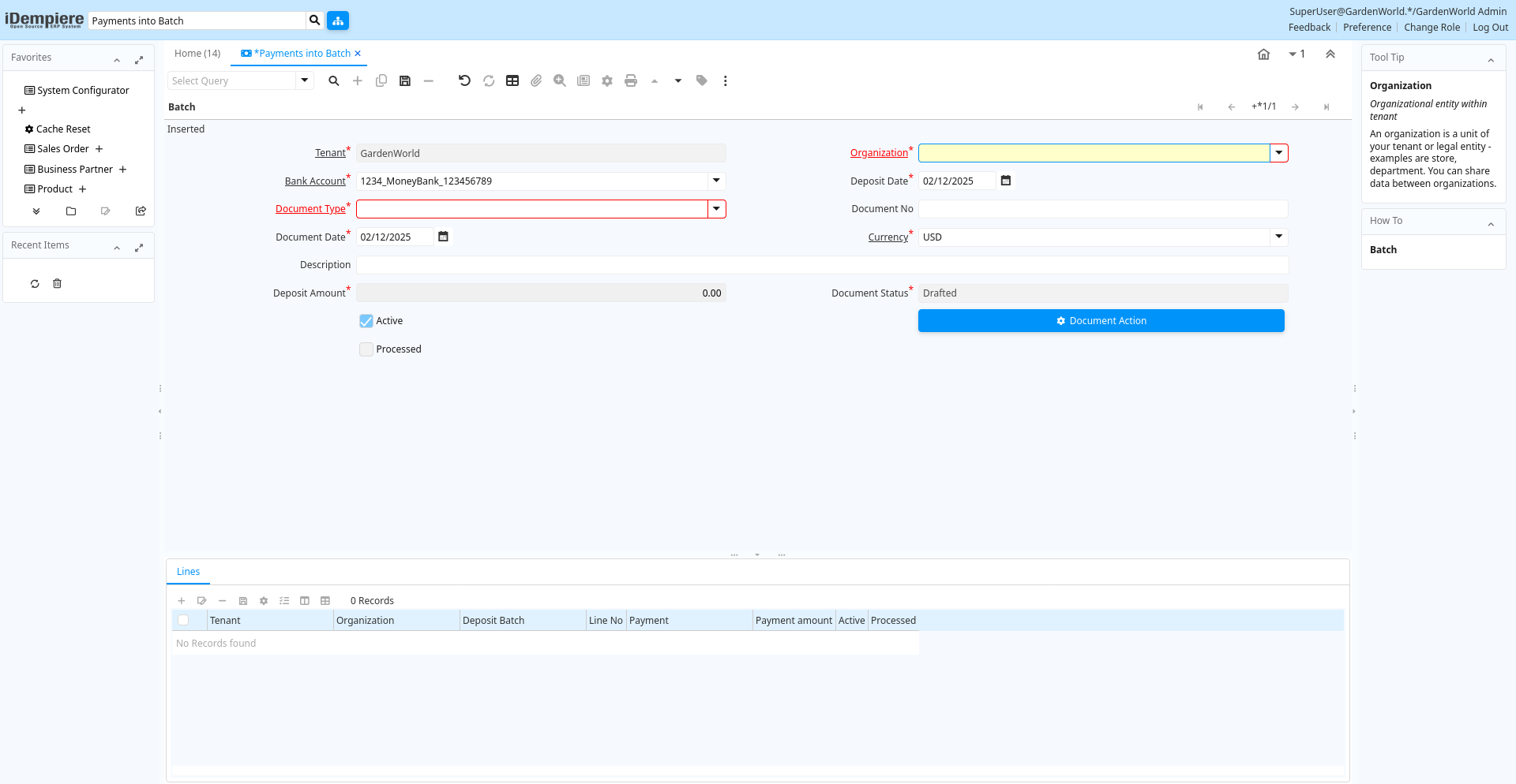 | Organization | Organizational entity within tenant | An organization is a unit of your tenant or legal entity - examples are store, department. You can share data between organizations. | c_depositbatchline.AD_Org_ID numeric(10) Table Direct |