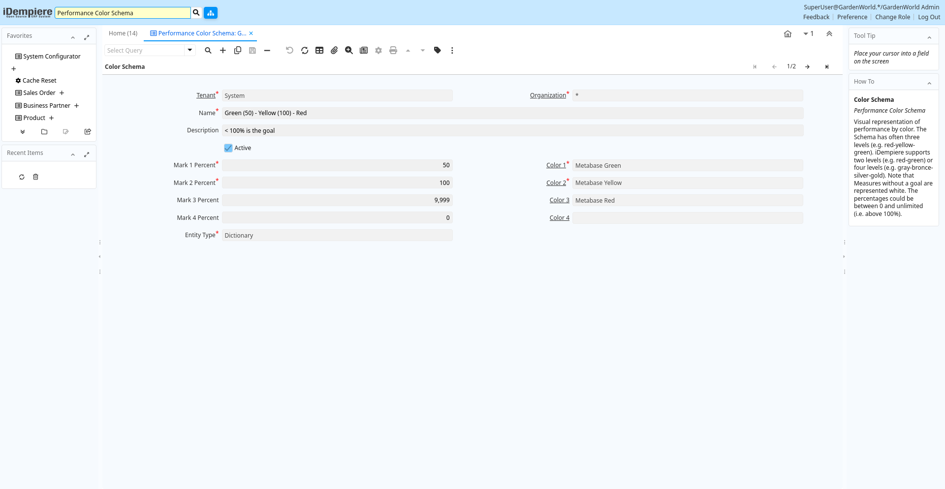 Help: Visual representation of performance by color. The Schema has often three levels (e.g. red-yellow-green). iDempiere supports two levels (e.g. red-green) or four levels (e.g. gray-bronce-silver-gold). Note that Measures without a goal are represented white. The percentages could be between 0 and unlimited (i.e. above 100%).