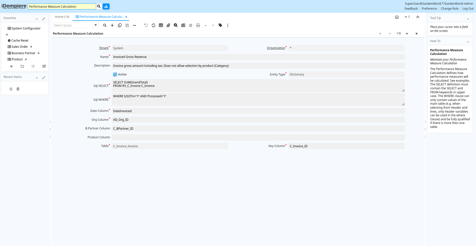 Help: The Performance Measure Calculation defines how performance measures will be calculated.The sql needs to return a single value. Please check examples.The date restriction is defined in the Goal.Any restrictions for Organizations, Business Partners, Products, etc. are as Performance Goal Restrictions.
