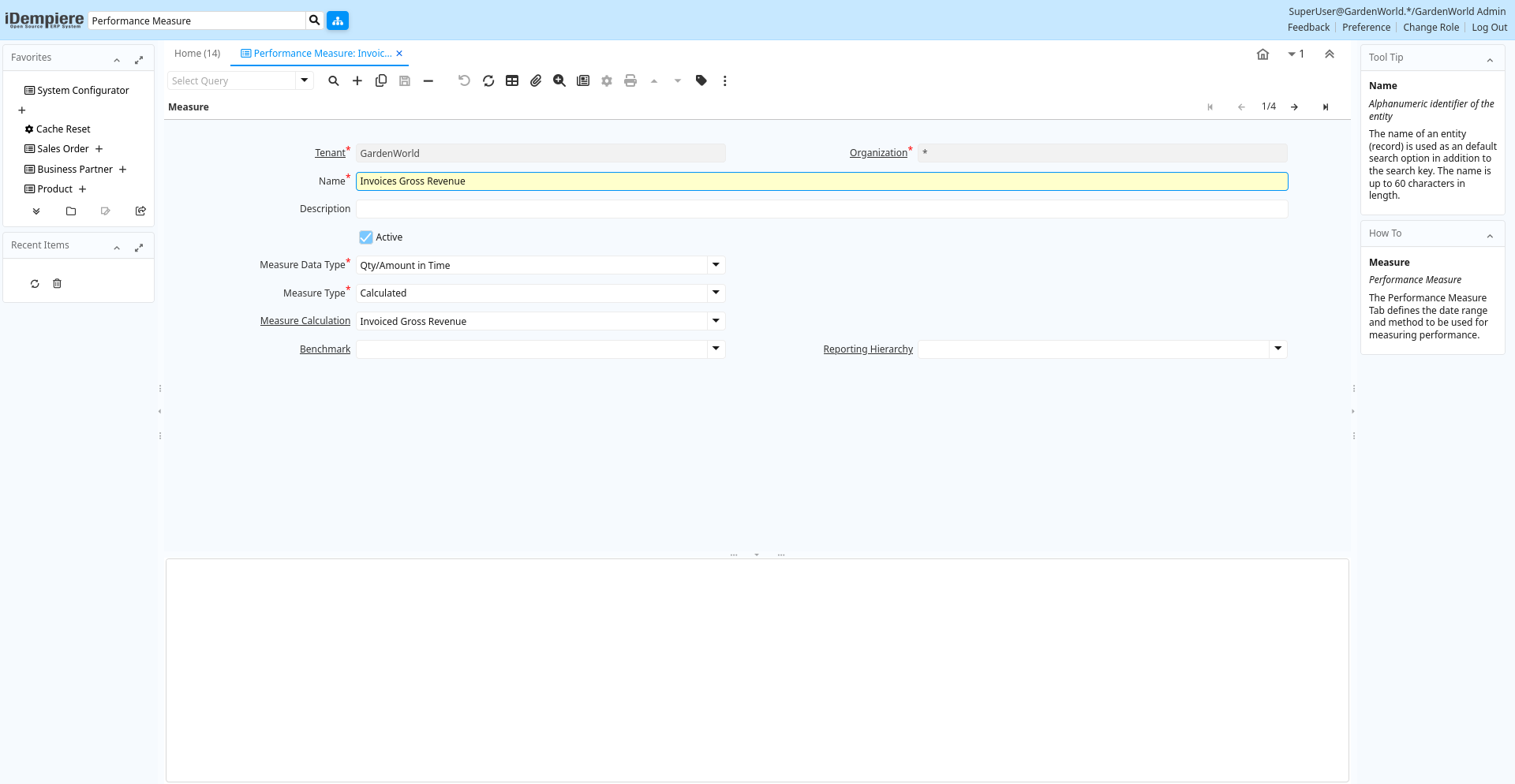 | Organization | Organizational entity within tenant | An organization is a unit of your tenant or legal entity - examples are store, department. You can share data between organizations. | pa_measure.AD_Org_ID numeric(10) Table Direct |