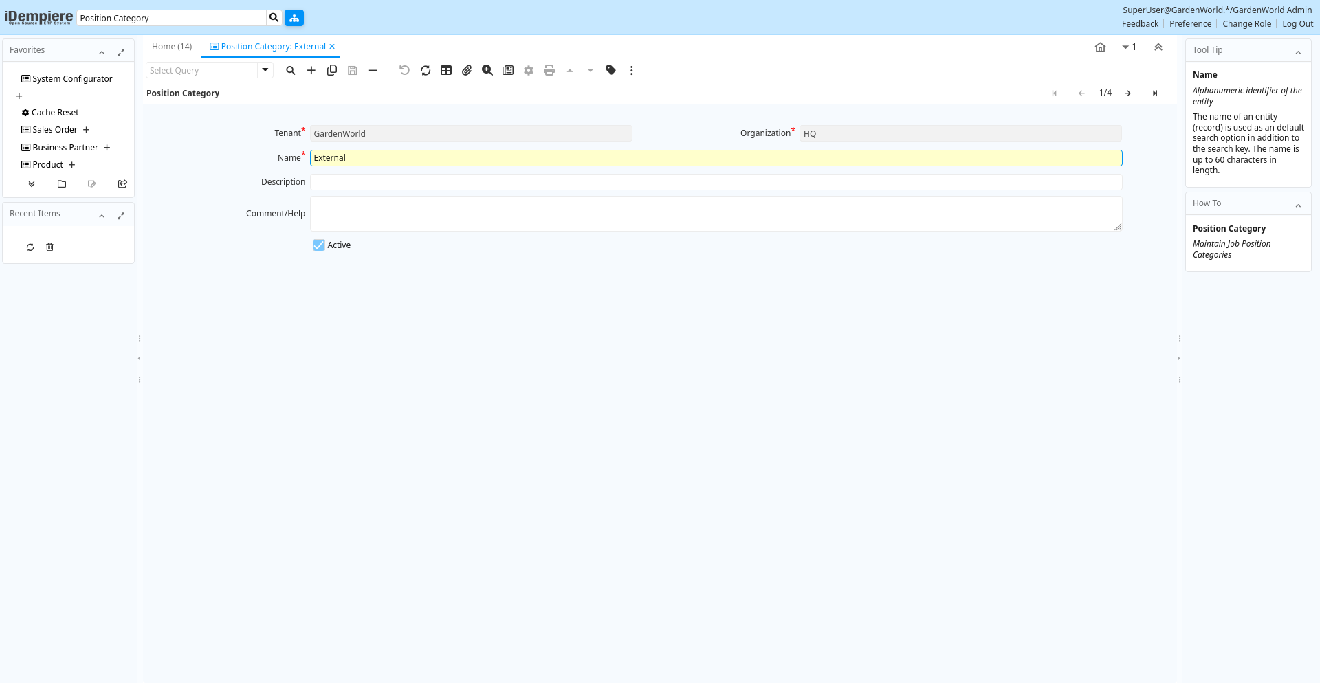 | Active | The record is active in the system | There are two methods of making records unavailable in the system: One is to delete the record, the other is to de-activate the record. A de-activated record is not available for selection, but available for reports.There are two reasons for de-activating and not deleting records:(1) The system requires the record for audit purposes.(2) The record is referenced by other records. E.g., you cannot delete a Business Partner, if there are invoices for this partner record existing. You de-activate the Business Partner and prevent that this record is used for future entries. | c_jobcategory.IsActive character(1) Yes-No |