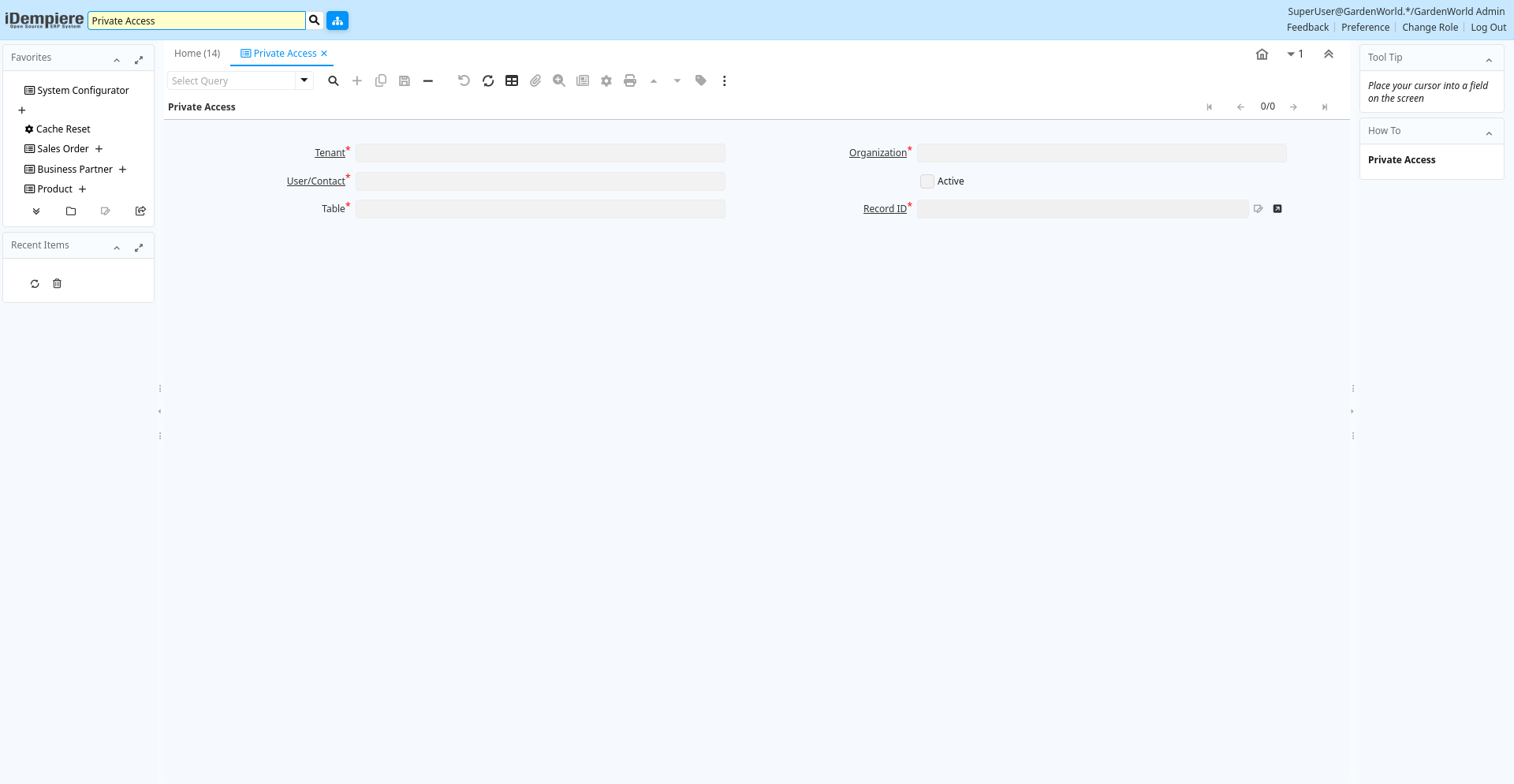 | Record ID | Direct internal record ID | The Record ID is the internal unique identifier of a record. Please note that zooming to the record may not be successful for Orders, Invoices and Shipment/Receipts as sometimes the Sales Order type is not known. | ad_private_access.Record_ID numeric(10) Record ID |