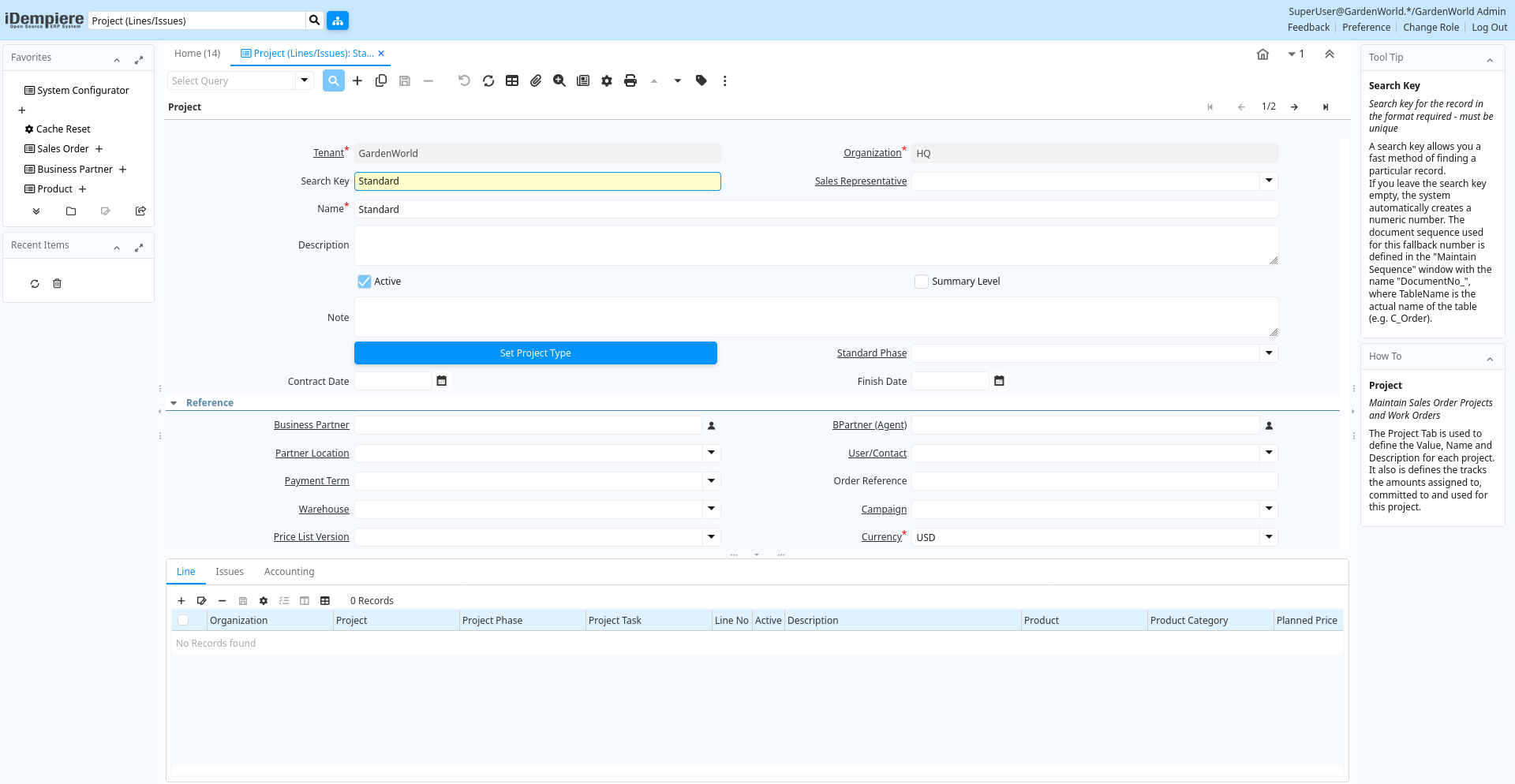 Help: The Project Lines Tab is used to define the lines (products and/or services) associated with this Project. This is an alternative to Project Phases. You would use lines, if you do not want to use a Project Type template with phases.