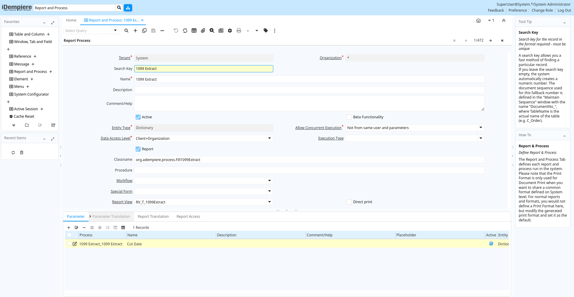 Help: The Report & Process Window is used to define the parameters and access rules for every Report and Process within the system. This window is for System Admin use only.
