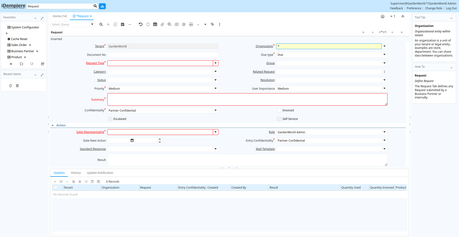 Help: The Request Tab defines any Request submitted by a Business Partner or internally.
