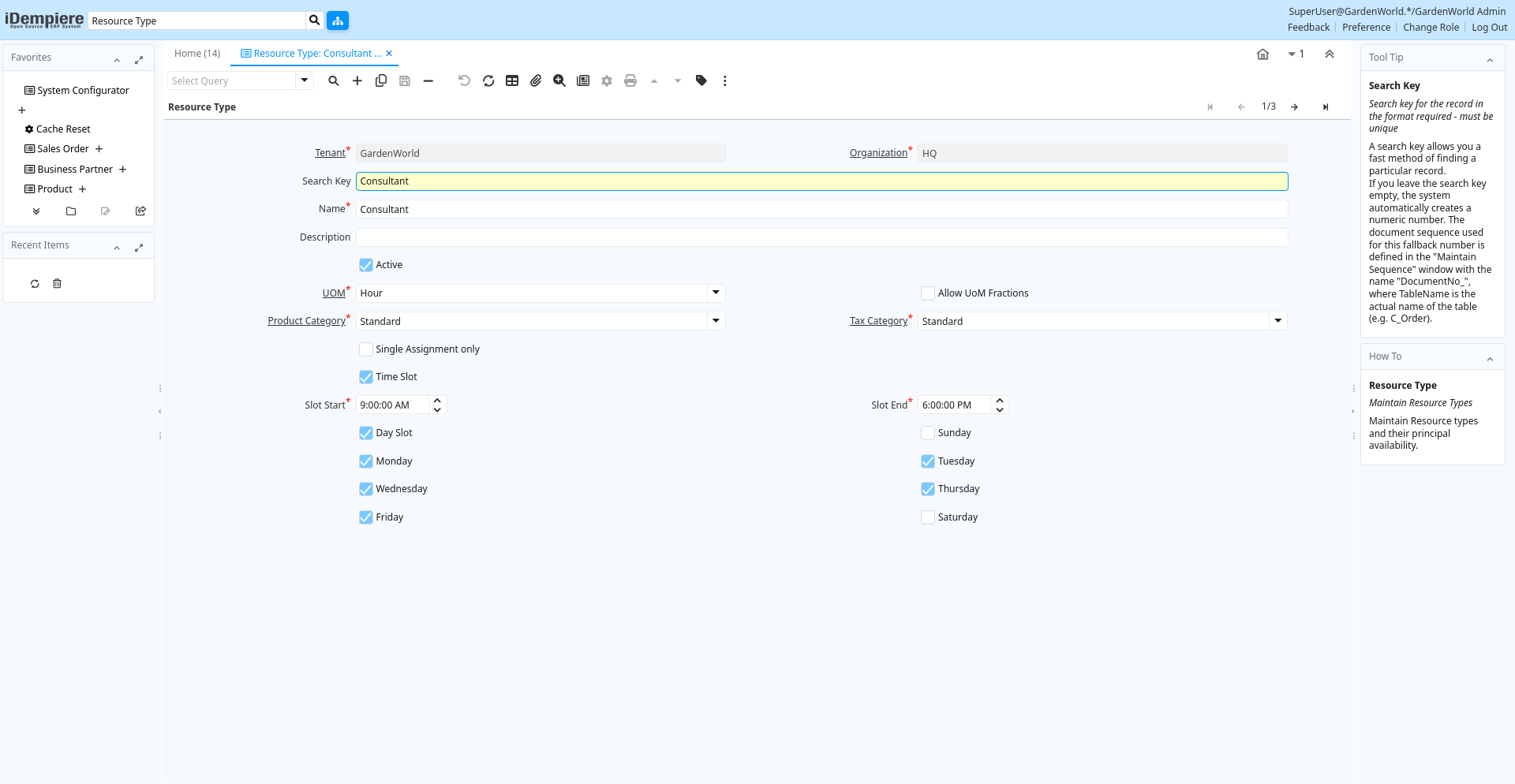 Help: Maintain Resource types and their principal availability. it is used to calculate the available time in a resource. It allows input of starting time and end time for the slot according to the working days.