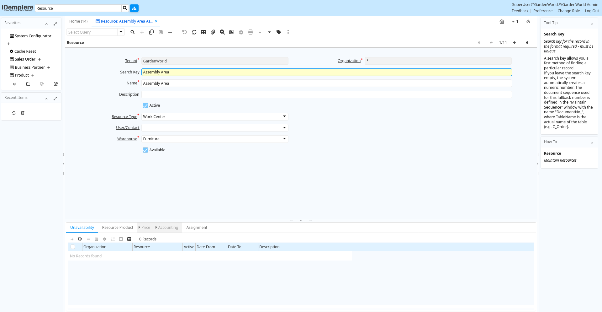 | Active | The record is active in the system | There are two methods of making records unavailable in the system: One is to delete the record, the other is to de-activate the record. A de-activated record is not available for selection, but available for reports.There are two reasons for de-activating and not deleting records:(1) The system requires the record for audit purposes.(2) The record is referenced by other records. E.g., you cannot delete a Business Partner, if there are invoices for this partner record existing. You de-activate the Business Partner and prevent that this record is used for future entries. | s_resourceunavailable.IsActive character(1) Yes-No |
