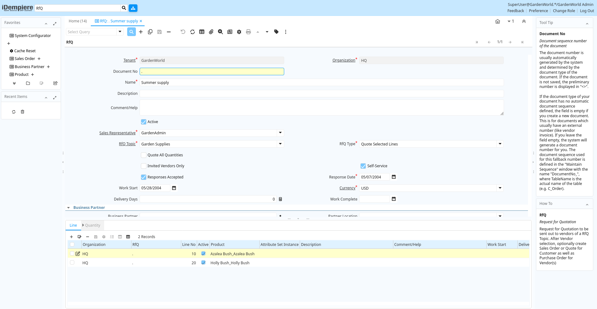 | Document No | Document sequence number of the document | The document number is usually automatically generated by the system and determined by the document type of the document. If the document is not saved, the preliminary number is displayed in "".If the document type of your document has no automatic document sequence defined, the field is empty if you create a new document. This is for documents which usually have an external number (like vendor invoice). If you leave the field empty, the system will generate a document number for you. The document sequence used for this fallback number is defined in the "Maintain Sequence" window with the name "DocumentNo_", where TableName is the actual name of the table (e.g. C_Order). | c_rfq.DocumentNo character varying(30) String |