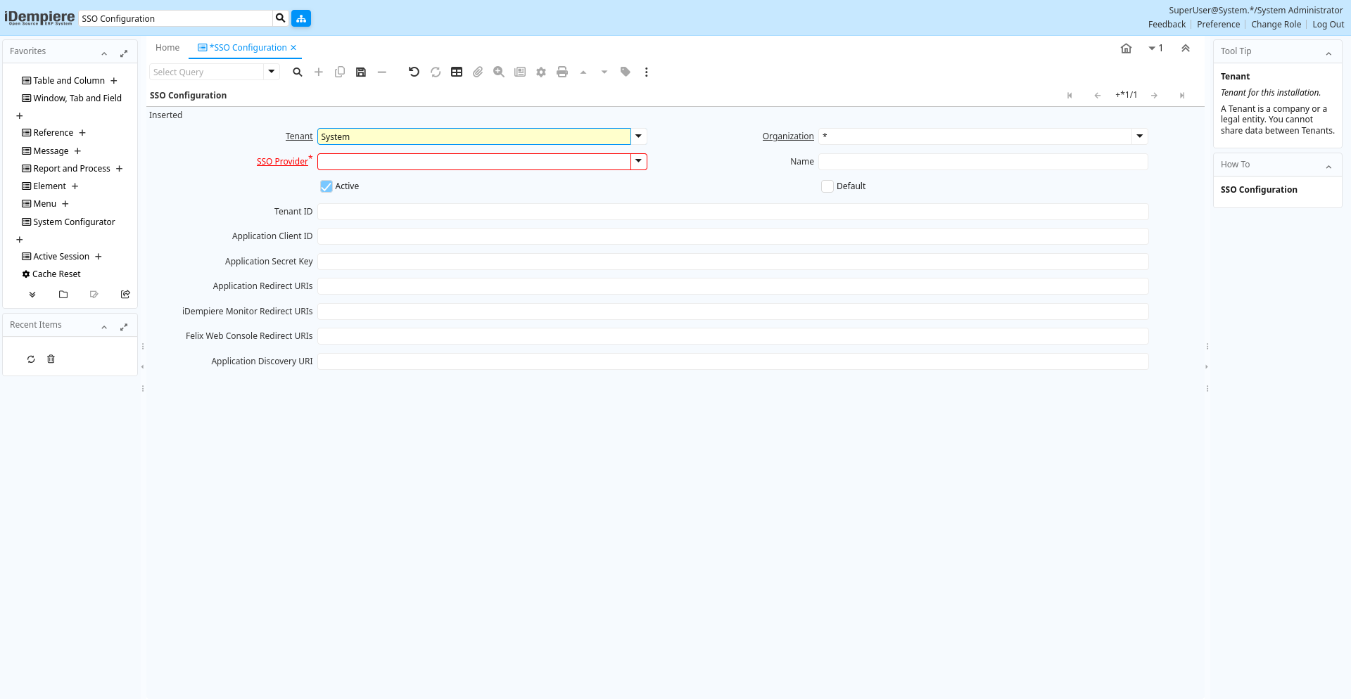 | Tenant | Tenant for this installation. | A Tenant is a company or a legal entity. You cannot share data between Tenants. | sso_principalconfig.AD_Client_ID numeric(10) Table Direct |