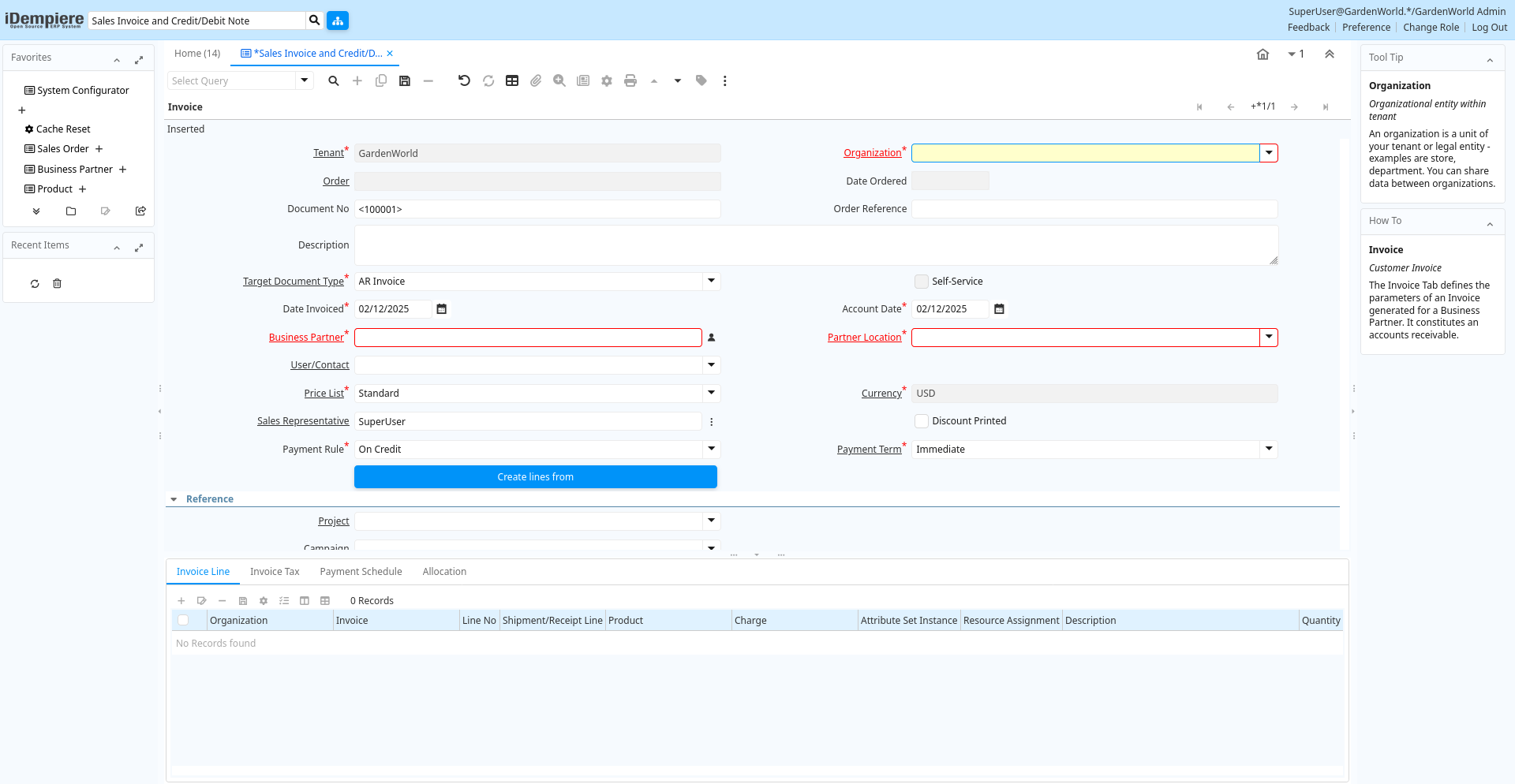 Help: The Invoice Tab defines the parameters of an Invoice generated for a Business Partner. It constitutes an accounts receivable.