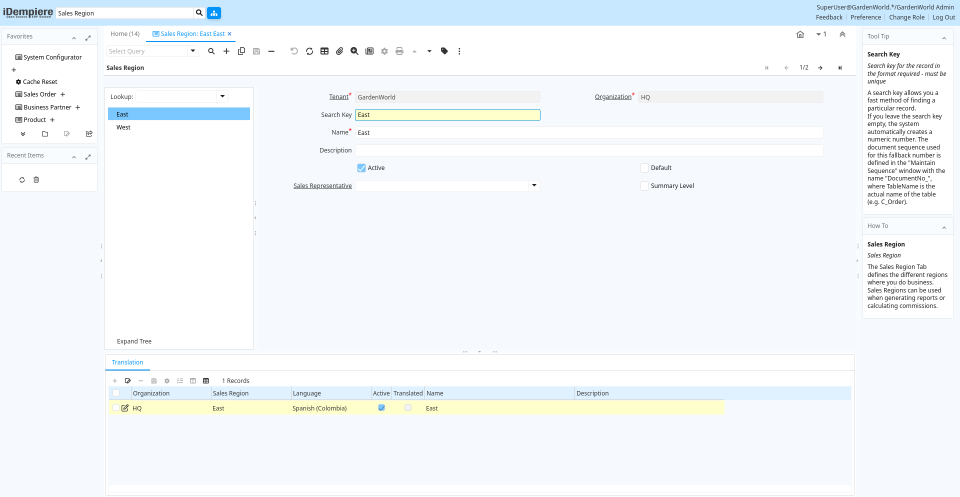 | Search Key | Search key for the record in the format required - must be unique | A search key allows you a fast method of finding a particular record.If you leave the search key empty, the system automatically creates a numeric number. The document sequence used for this fallback number is defined in the "Maintain Sequence" window with the name "DocumentNo_", where TableName is the actual name of the table (e.g. C_Order). | c_salesregion.Value character varying(40) String |