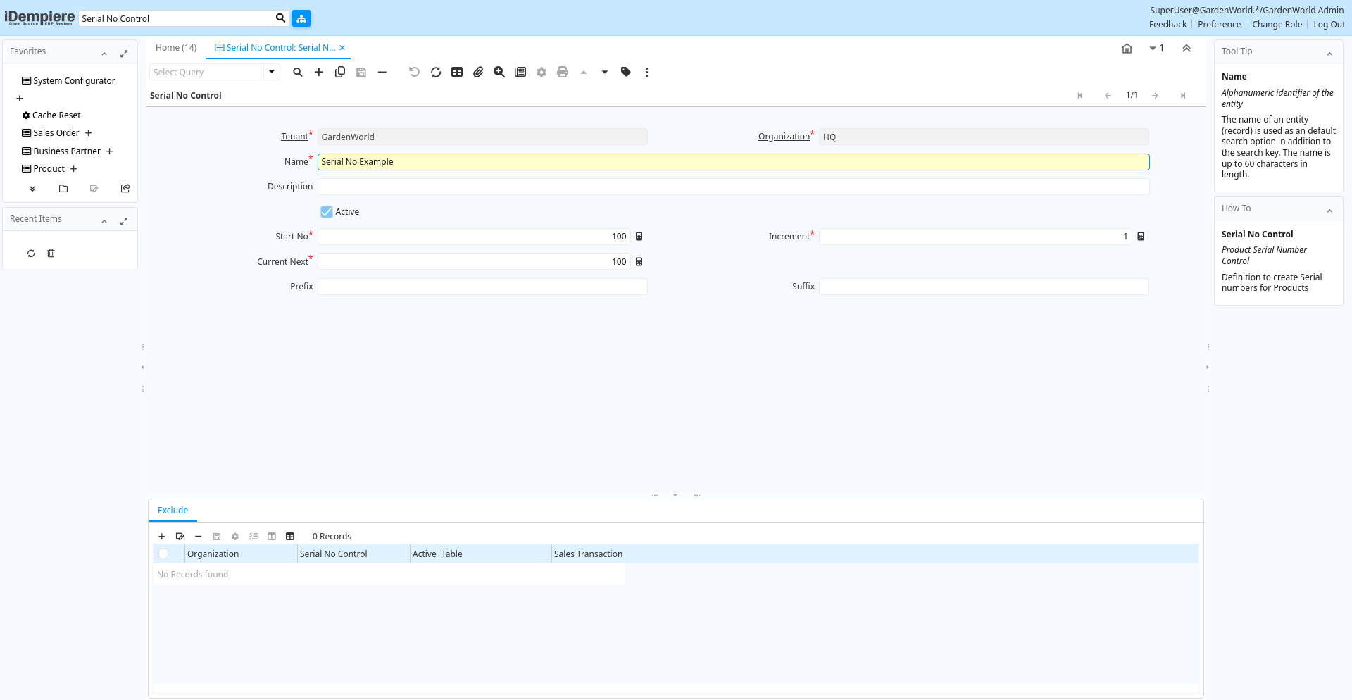 | Active | The record is active in the system | There are two methods of making records unavailable in the system: One is to delete the record, the other is to de-activate the record. A de-activated record is not available for selection, but available for reports.There are two reasons for de-activating and not deleting records:(1) The system requires the record for audit purposes.(2) The record is referenced by other records. E.g., you cannot delete a Business Partner, if there are invoices for this partner record existing. You de-activate the Business Partner and prevent that this record is used for future entries. | m_sernoctlexclude.IsActive character(1) Yes-No |