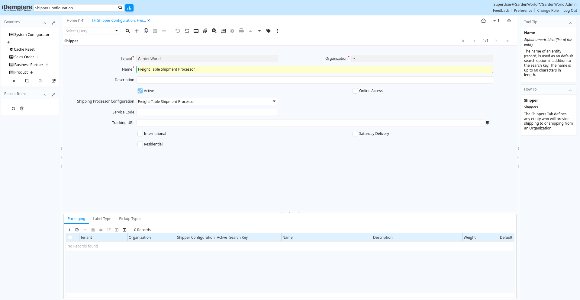 | Name | Alphanumeric identifier of the entity | The name of an entity (record) is used as an default search option in addition to the search key. The name is up to 60 characters in length. | m_shipperpackagingcfg.Name character varying(60) String |