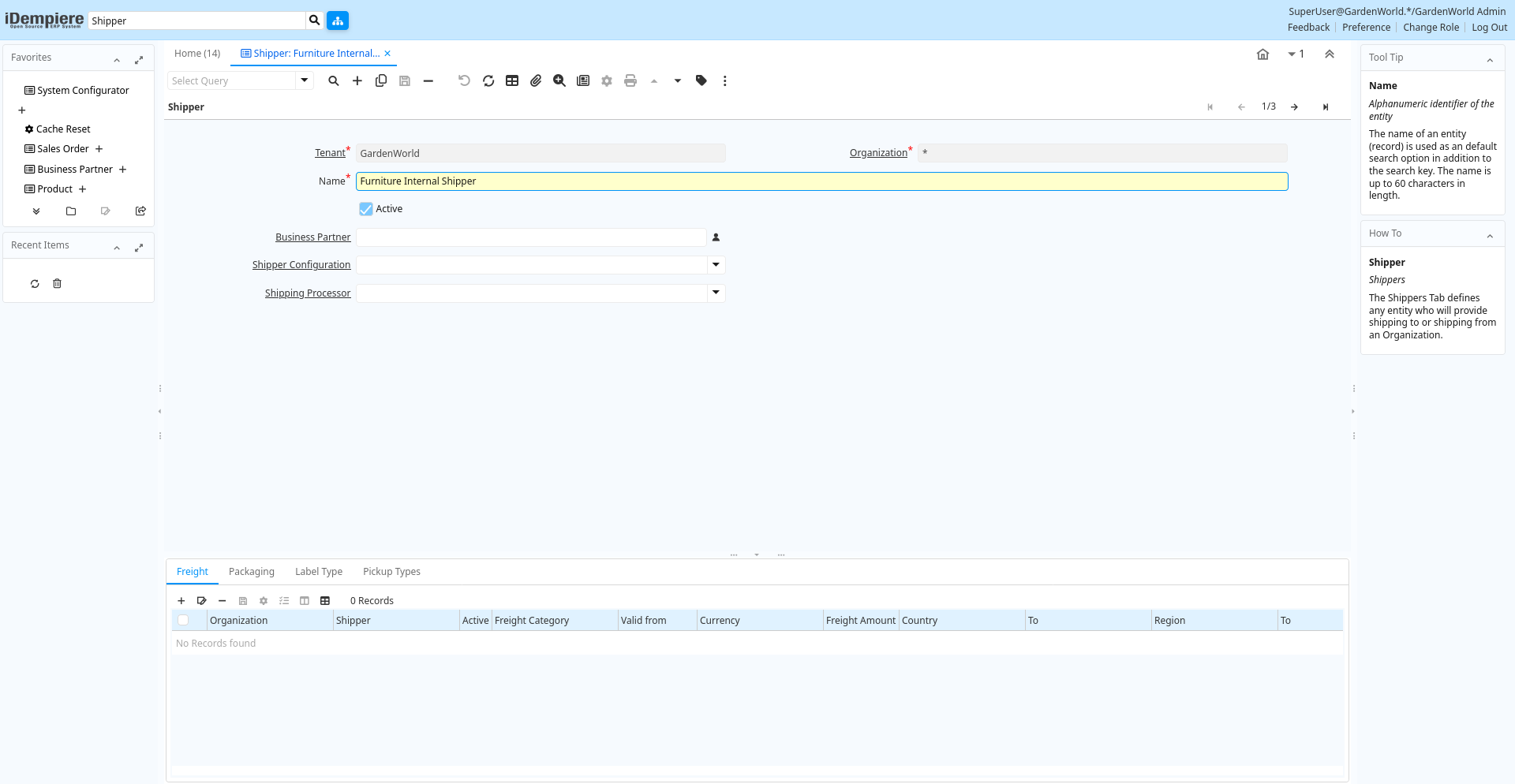 Help: The Shipper Window defines the different shipping provides used by an Organization. When a delivery method of Shipper is used on an Order a predefined Shipper must be selected.