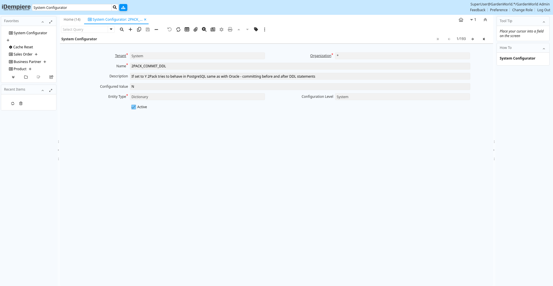 | Active | The record is active in the system | There are two methods of making records unavailable in the system: One is to delete the record, the other is to de-activate the record. A de-activated record is not available for selection, but available for reports.There are two reasons for de-activating and not deleting records:(1) The system requires the record for audit purposes.(2) The record is referenced by other records. E.g., you cannot delete a Business Partner, if there are invoices for this partner record existing. You de-activate the Business Partner and prevent that this record is used for future entries. | ad_sysconfig.IsActive character(1) Yes-No |