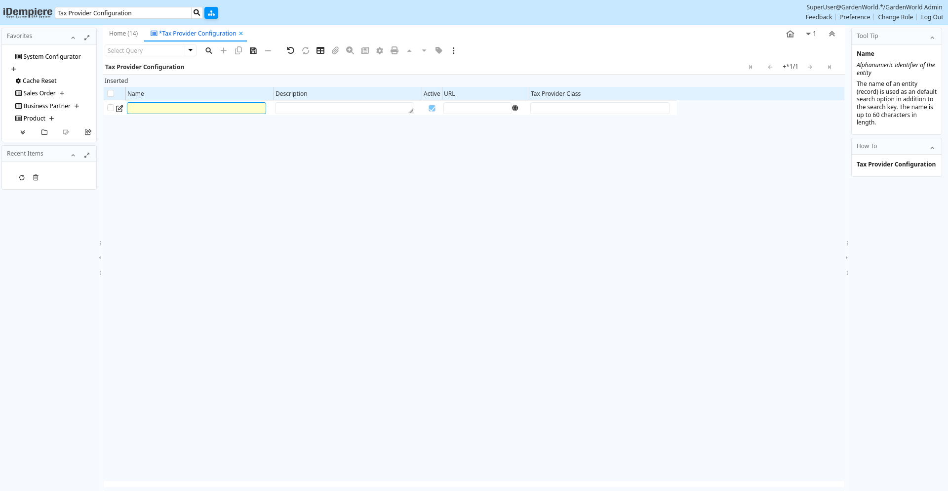 | Name | Alphanumeric identifier of the entity | The name of an entity (record) is used as an default search option in addition to the search key. The name is up to 60 characters in length. | c_taxprovidercfg.Name character varying(120) String |