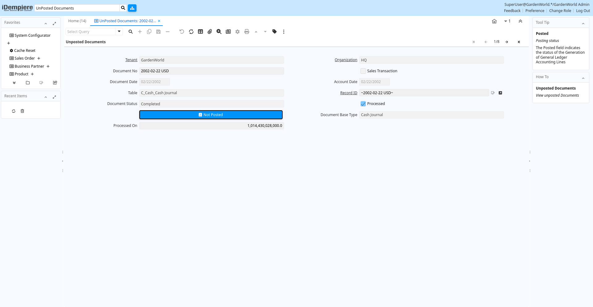 | Processed | The document has been processed | The Processed checkbox indicates that a document has been processed. | rv_unposted.Processed character(1) Yes-No |