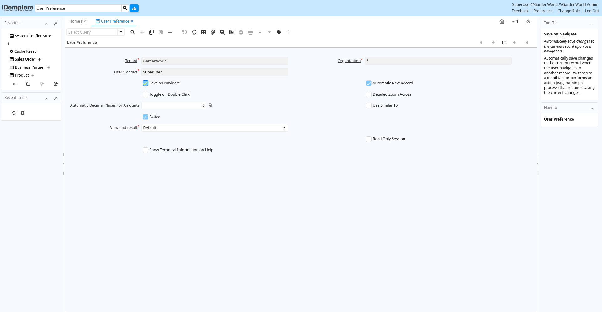 | Save on Navigate | Automatically save changes to the current record upon user navigation. | Automatically save changes to the current record when the user navigates to another record, switches to a detail tab, or performs an action (e.g., running a process) that requires saving the current changes. | ad_userpreference.AutoCommit character(1) Yes-No |