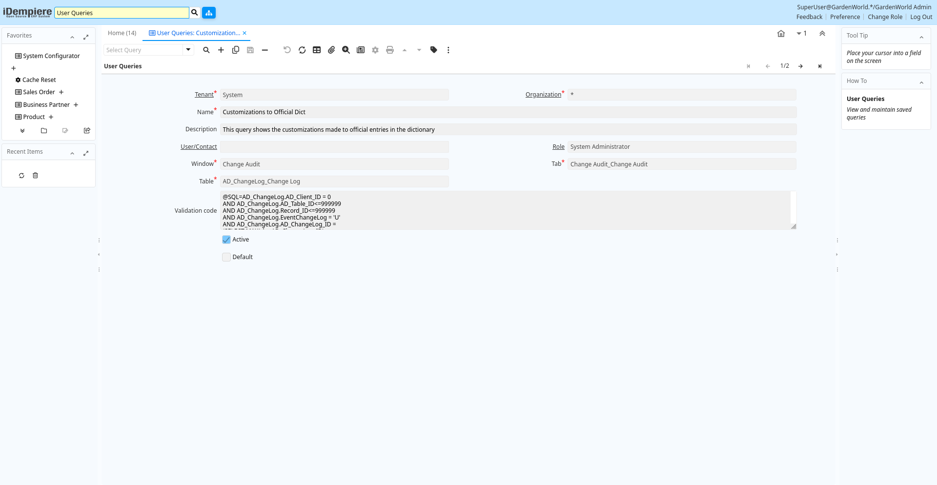 | Validation code | Validation Code | The Validation Code displays the date, time and message of the error.You can add advanced SQL queries to your searches by filling this field with @SQL=[WHERE CLAUSE].Do not include the WHERE statement and use Fully qualified SQL statements. F.e:@SQL=C_Order.isActive='Y' AND SalesRep_ID=@AD_User_ID@ will filter orders by active and where the sales representative is the current user. | ad_userquery.Code character varying(4000) String |