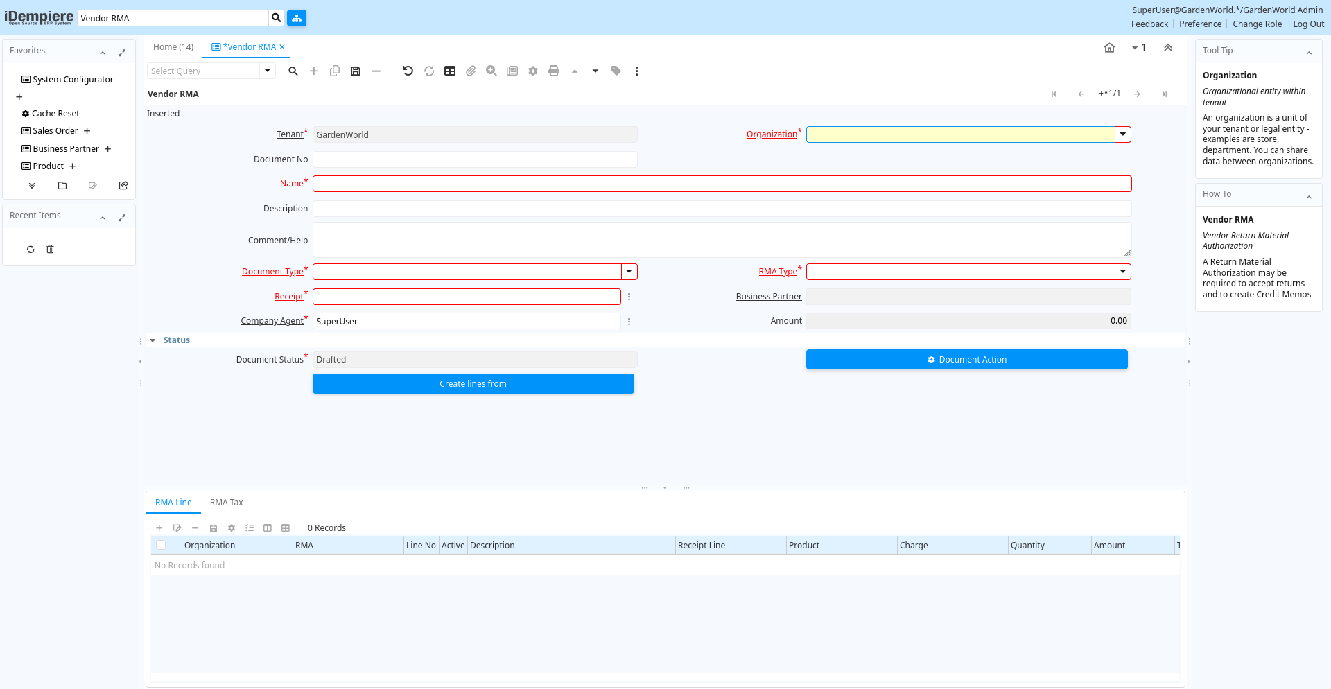 | RMA | Return Material Authorization | A Return Material Authorization may be required to accept returns and to create Credit Memos | m_rmaline.M_RMA_ID numeric(10) Search |