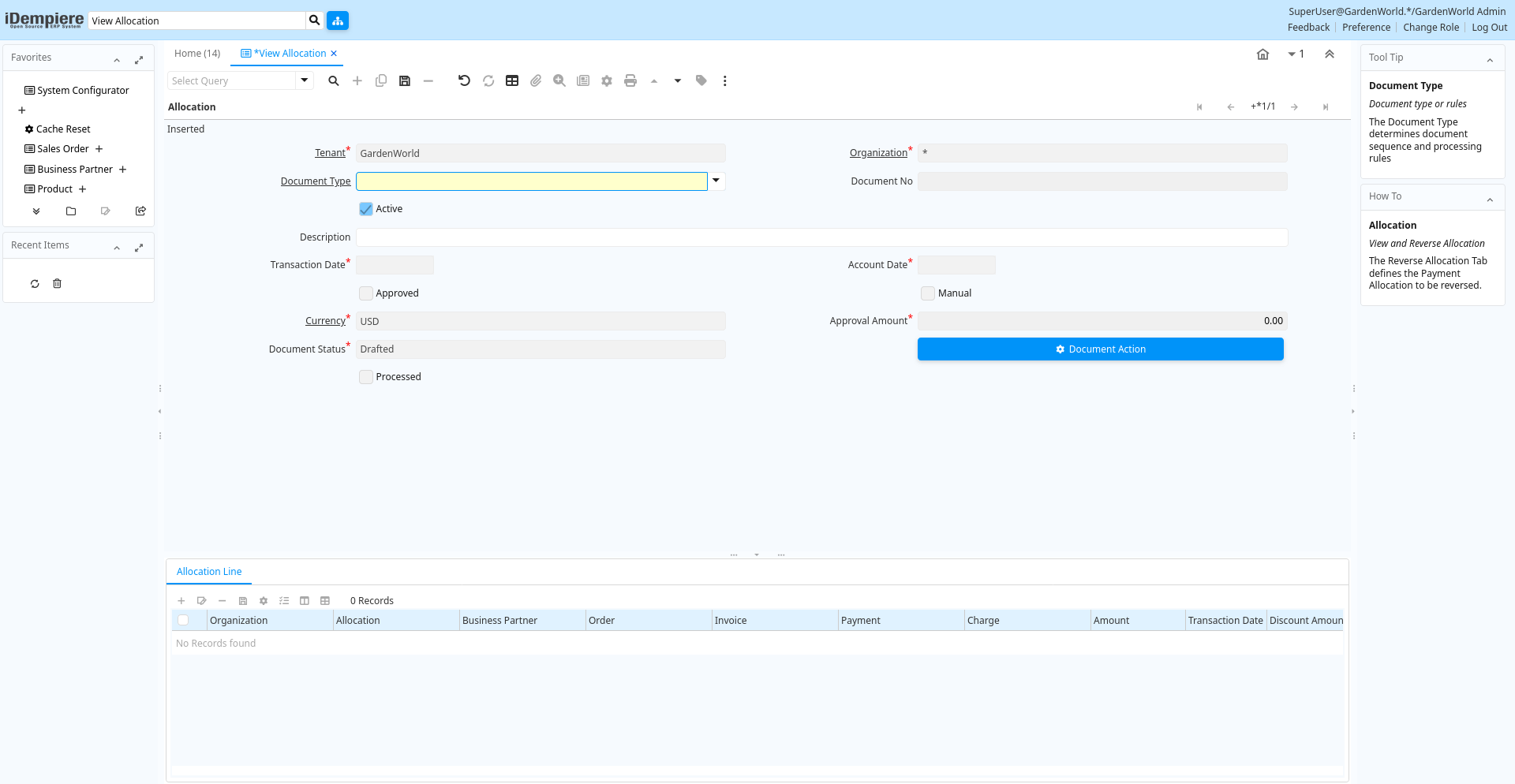 | Document Type | Document type or rules | The Document Type determines document sequence and processing rules | c_allocationhdr.C_DocType_ID numeric(10) Table Direct |