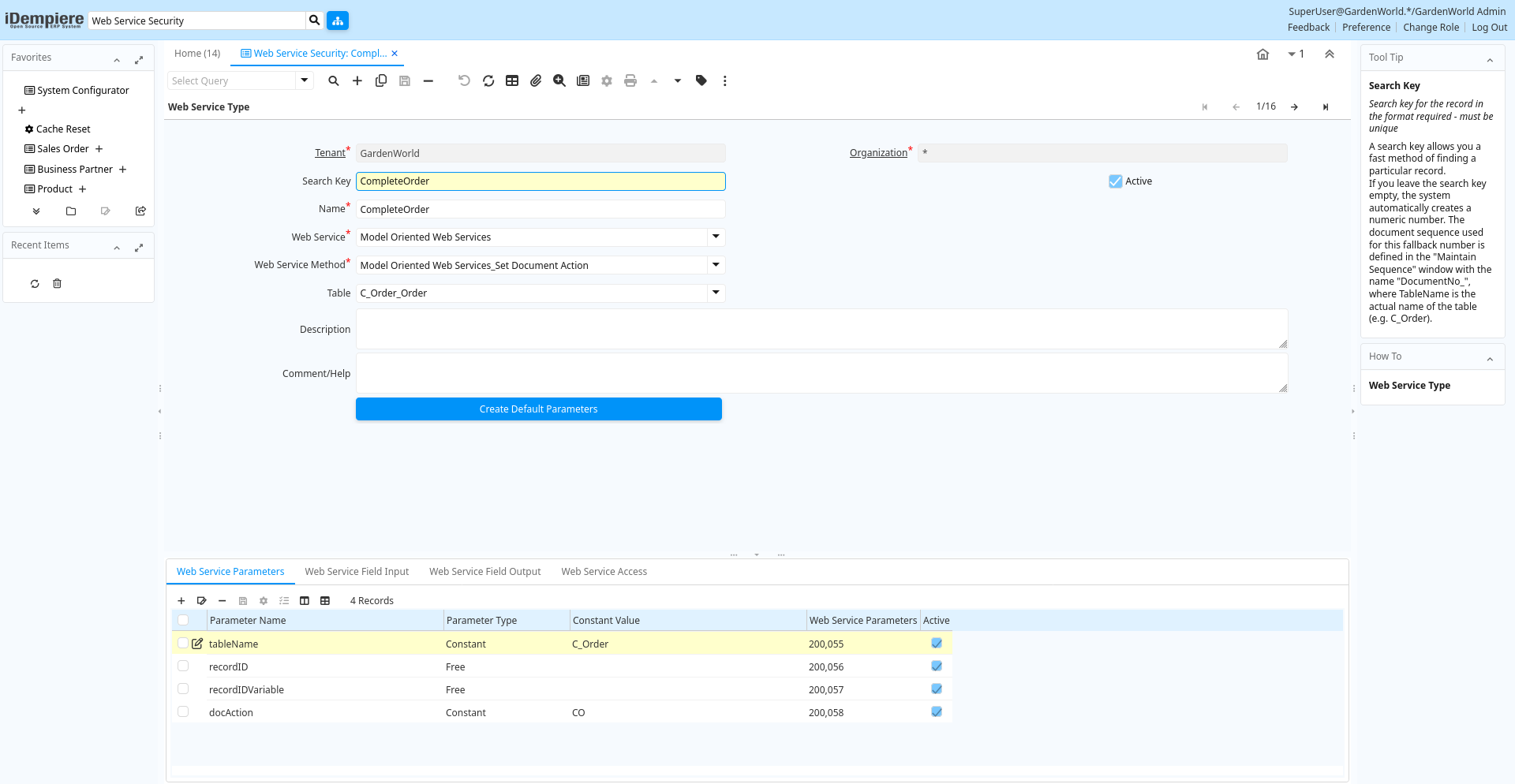 | Search Key | Search key for the record in the format required - must be unique | A search key allows you a fast method of finding a particular record.If you leave the search key empty, the system automatically creates a numeric number. The document sequence used for this fallback number is defined in the "Maintain Sequence" window with the name "DocumentNo_", where TableName is the actual name of the table (e.g. C_Order). | ws_webservicetype.Value character varying(40) String |