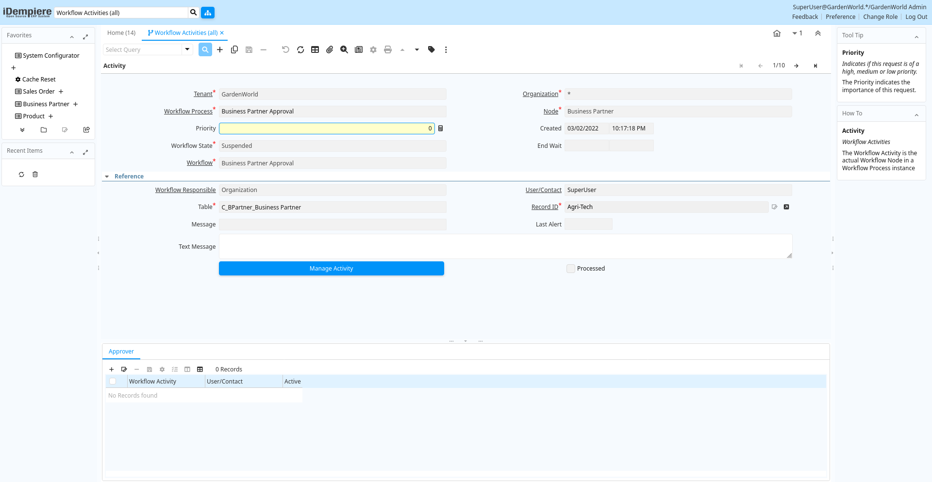 | Record ID | Direct internal record ID | The Record ID is the internal unique identifier of a record. Please note that zooming to the record may not be successful for Orders, Invoices and Shipment/Receipts as sometimes the Sales Order type is not known. | ad_wf_activity.Record_ID numeric(10) Record ID |