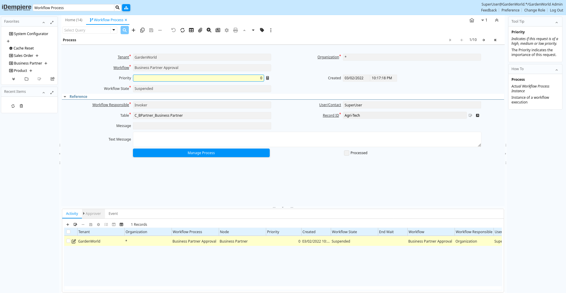 | Workflow Process | Actual Workflow Process Instance | Instance of a workflow execution | ad_wf_activity.AD_WF_Process_ID numeric(10) Search |