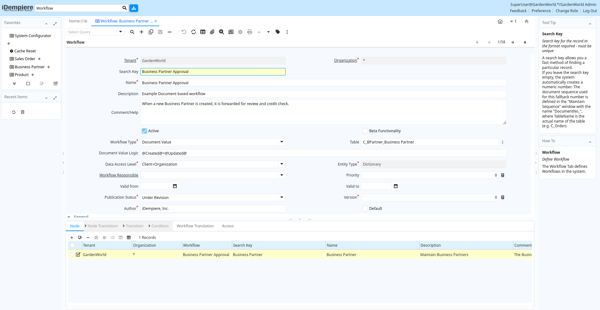 | Search Key | Search key for the record in the format required - must be unique | A search key allows you a fast method of finding a particular record.If you leave the search key empty, the system automatically creates a numeric number. The document sequence used for this fallback number is defined in the "Maintain Sequence" window with the name "DocumentNo_", where TableName is the actual name of the table (e.g. C_Order). | ad_workflow.Value character varying(40) String |