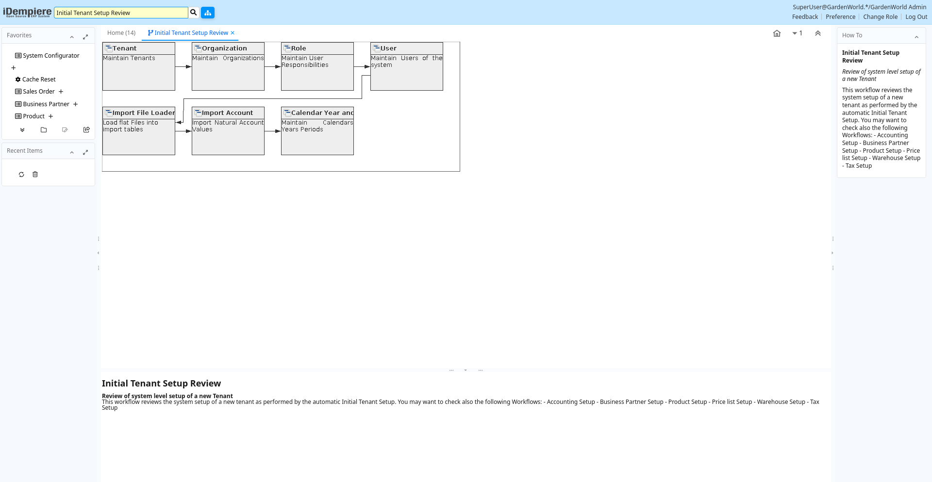 Help: This workflow reviews the system setup of a new tenant as performed by the automatic Initial Tenant Setup.You may want to check also the following Workflows:- Accounting Setup- Business Partner Setup- Product Setup- Price list Setup- Warehouse Setup- Tax Setup
