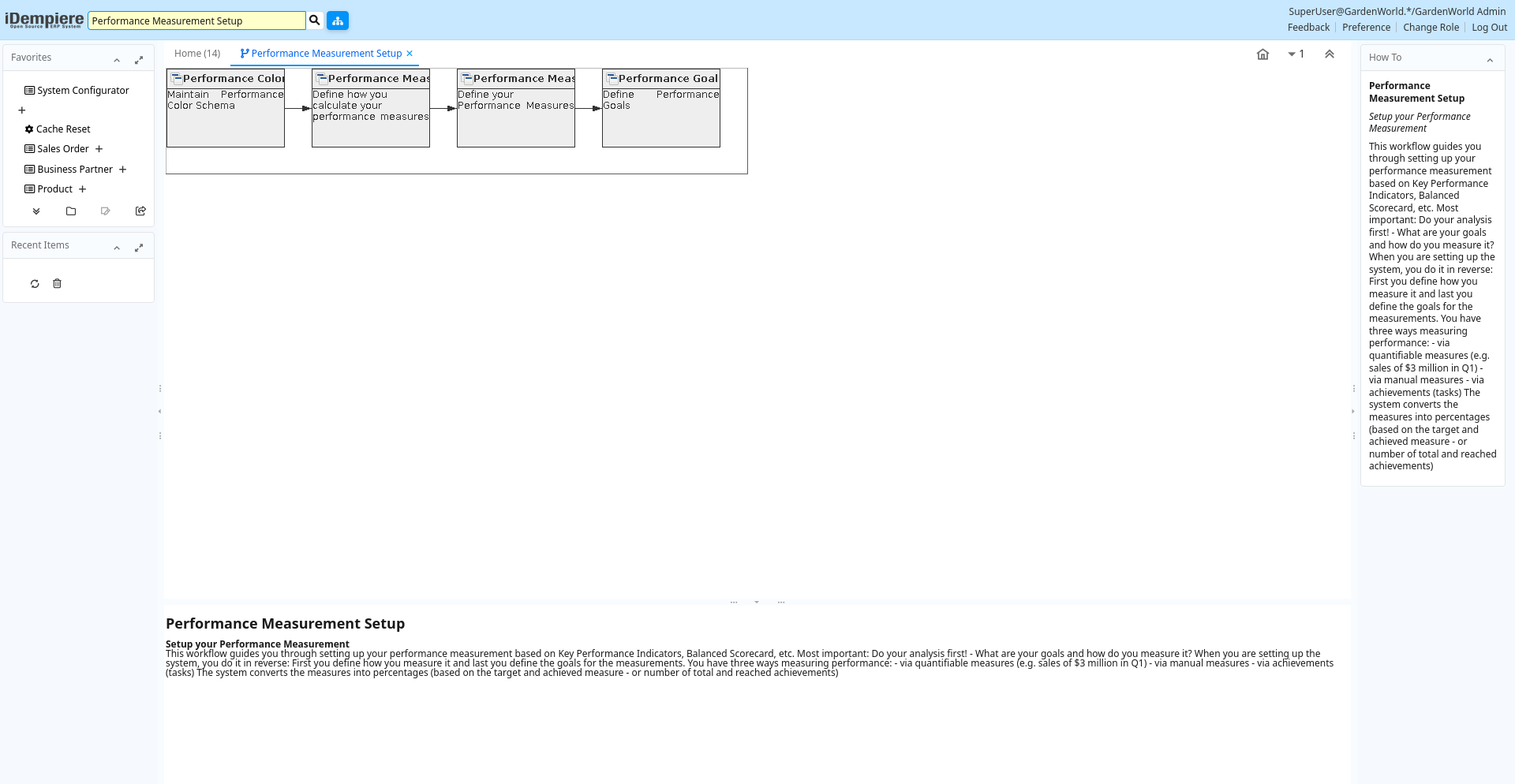 Help: This workflow guides you through setting up your performance measurement based on Key Performance Indicators, Balanced Scorecard, etc.Most important: Do your analysis first!- What are your goals and how do you measure it?When you are setting up the system, you do it in reverse:First you define how you measure it and last you define the goals for the measurements.You have three ways measuring performance:- via quantifiable measures (e.g. sales of million in Q1)- via manual measures- via achievements (tasks)The system converts the measures into percentages (based on the target and achieved measure - or number of total and reached achievements)